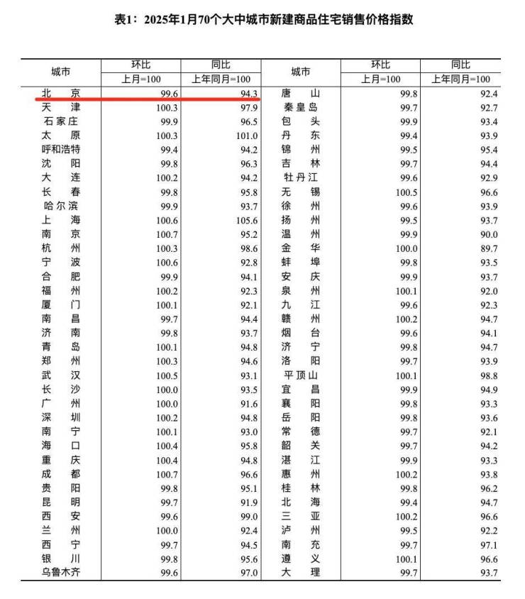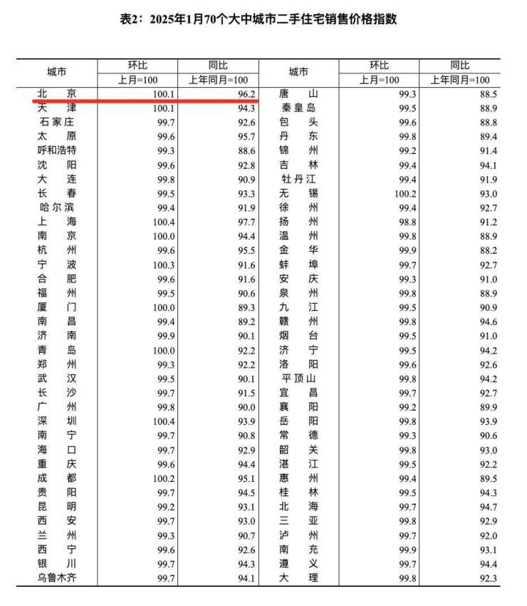 不止北京,分城市等级来看,1月份一线城市二手住宅销售价格环比上涨0.1%;同比下降5.6%,降幅比上月收窄1.1个百分点。
