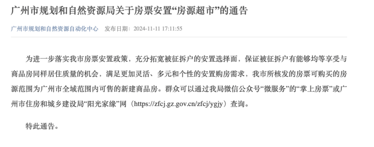 11月11日,广州市规划和自然资源局发布《广州市规划和自然资源局关于房票安置“房源超市”的通告》(以下简称《通告》)。《通知》表示,为进一步落实我市房票安置政策,充分拓宽被征拆户的安置选择面,保证被征拆户有能够均等享受与商品房同样居住质量的机会,满足更加灵活、多元和个性的安置购房需求,广州市所核发的房票可购买的房源范围为广州市全域范围内可售的新建商品房。