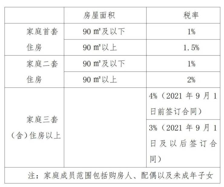 按照契税缴纳现行适用税率,对于家庭首套住房,房屋面积在90平方米及以下,税率1%;90平方米以上,税率1.5%。对于家庭二套住房,房屋面积在90平方米及以下,税率1%;90平方米以上,税率2%。对于家庭三套(含)住房以上,税率为4%(2021年9月1日前签订合同)或3%(2021年9月1日以后签订合同)。