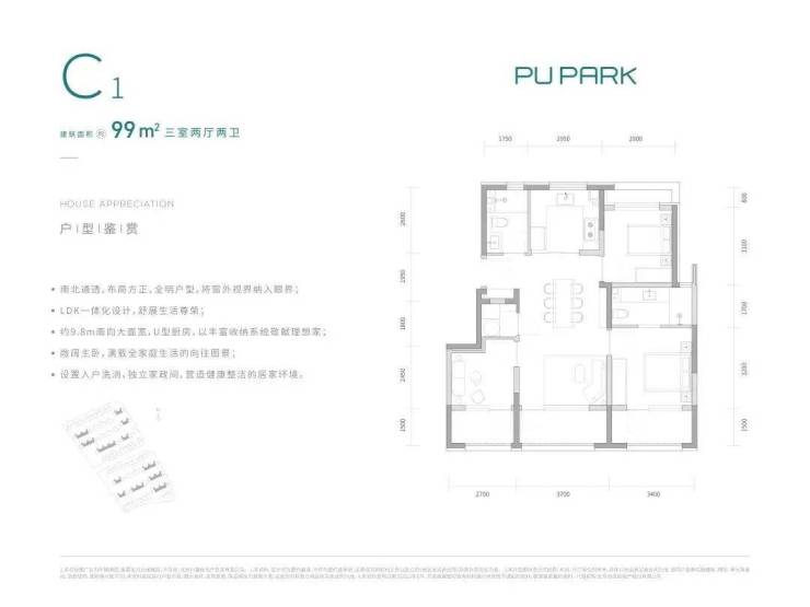 99㎡三居两卫,南向三面宽约9.8米,方正通透,餐客厨一体化,带有独立家政间,据说得房率在90%左右。