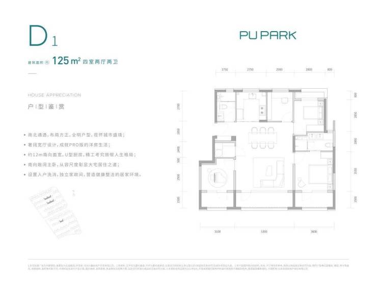 125㎡四居两卫,约5.3米客厅面宽+通透大玻璃,约3.6米的主卧套房配置双台盆,更显改善气质,北向四面宽采光,得房率约在93%左右。