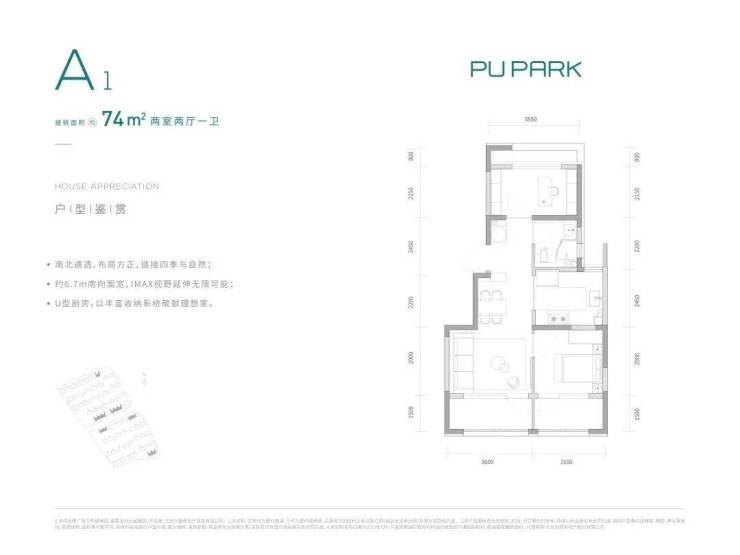 74㎡两居,南北通透+全明格局,客厅面宽约3.6米,主卧面宽3.1米,北向卧室面宽3.85米;入口处设有玄关,U型厨房,空间利用率很高。