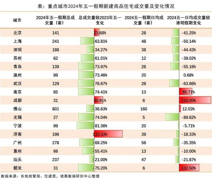 成都、北京在限购政策松动的刺激下,今年五一新房成交活跃度赶超去年,成交量同比均涨超20%。