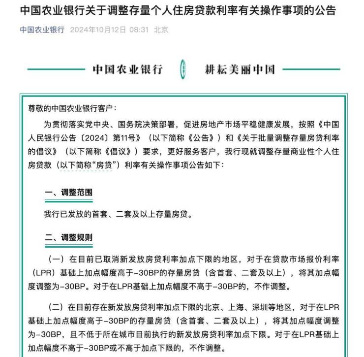 农业银行也宣布,为贯彻落实党中央、国务院决策部署,促进房地产市场平稳健康发展,按照《中国人民银行公告〔2024〕第11号》(以下简称《公告》)和《关于批量调整存量房贷利率的倡议》(以下简称《倡议》)要求,更好服务客户,农业银行现就调整存量商业性个人住房贷款(以下简称“房贷”)利率有关操作事项公告如下: