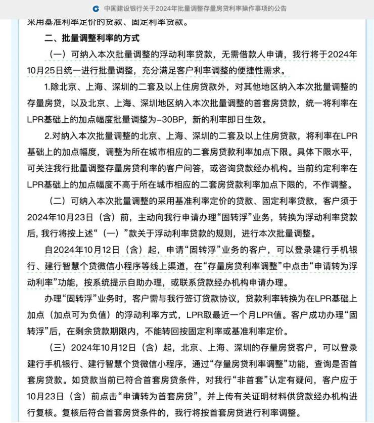 (二)可纳入本次批量调整的采用基准利率定价的贷款、固定利率贷款,客户须于2024年10月23日(含)前,主动向中国建设银行申请办理“固转浮”业务,转换为浮动利率贷款后,中国建设银行将按上述“(一)”款关于浮动利率贷款的规则,进行本次批量调整。