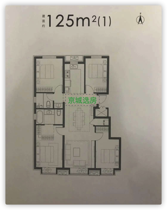 125㎡:南北通透,南向三面采光,双卫生间,布局合理,,南向三个飘窗增加得房率。