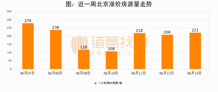 根据诸葛找房数据显示,北京24小时涨价房源量为221套,较06月12日增加13套,环比上涨6.2%。与此同时,涨价房源占比小幅扩大,业主信心有所提升。