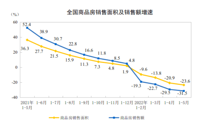 国家统计局数据显示,今年1-5月份,商品房销售面积约5.07亿平方米,同比下降23.6%,其中住宅销售面积下降28.1%;商品房销售额48337亿元,同比下降31.5%,其中住宅销售额下降34.5%。截至5月末,商品房待售面积5.54亿平方米,同比增长8.6%,其中住宅待售面积增长15.0%。