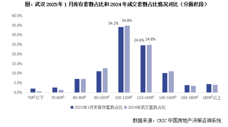 不过值得一提的是,武汉城市外围低价值片区、新区库存占比仍相对较高,且有逐步增加态势。克而瑞数据显示,截至今年1月末,武汉东西湖区、黄陂区库存套数占比分别达到14.28%、10.39%,较2024年末分别增长了0.07%、0.22%,尤其以100—140平方米产品库存占比较高。