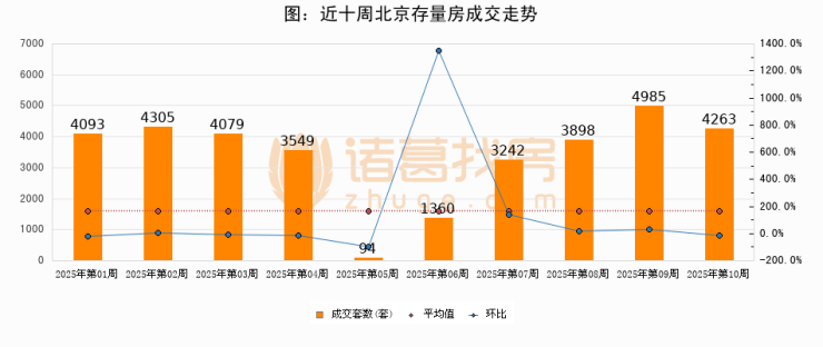 存量房方面,第10周北京存量房成交4263套,较上周减少722套,环比下降14.5%。从近十周成交走势来看,周均成交套数为3386套,本周高于平均水平25.9%。