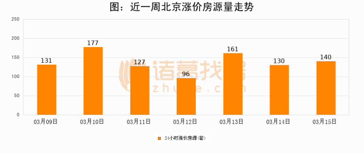 根据诸葛找房数据显示,北京24小时涨价房源量为140套,较03月14日增加10套,环比上涨7.7%。与此同时,涨价房源占比小幅扩大,业主信心有所提升。