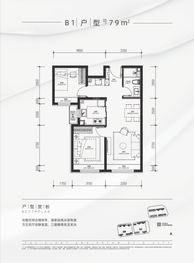 79㎡两居,标准的纯南两居户型,南向总面宽接近8.2m,可以说是两居中的佼佼者了!