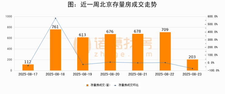 从存量房来看,2025年08月23日北京存量房单日成交203套,比昨日减少506套,环比下降71.4%。从近一周存量房成交来看,北京存量房日均成交套数为536套,08月23日单日成交203套,低于近一周平均水平62.1%。