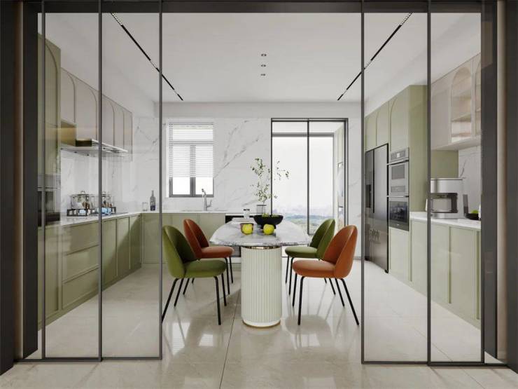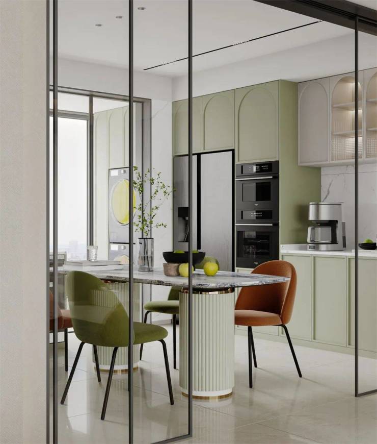 餐厅中大面积的使用清新绿,清新绿的橱柜,与大理石质感的岩板、瓷砖互为补充,内嵌式家电、无把手设计,让空间有了简约而连贯的整体感,餐桌与椅子与法式餐厅中的设计相同,让用餐充满仪式感。