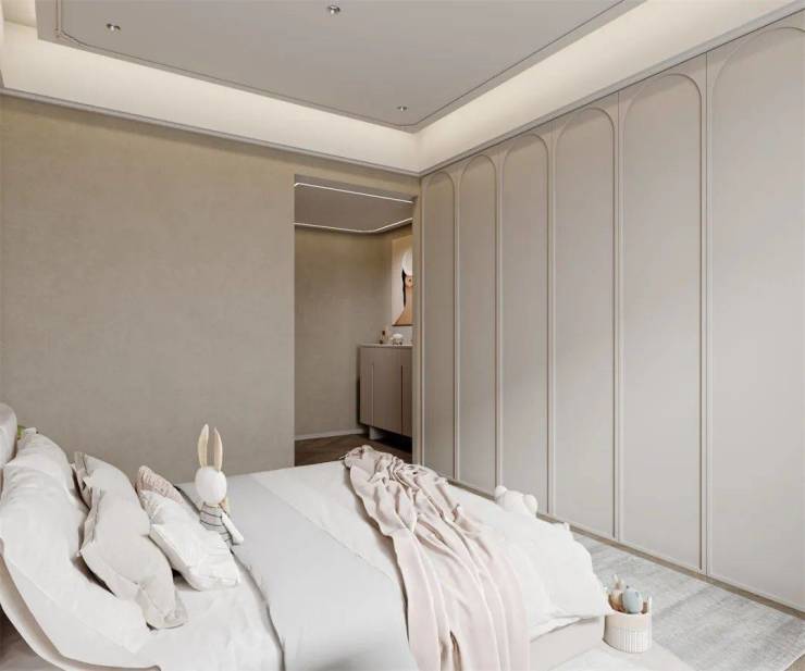 整体氛围温润雅致,线条虽然简约利落,但不乏设计感,鱼骨的木地板和精致的石膏线,恰到好处地增加了空间的格调,一整面衣柜,满足居住者的收纳需求,空间也更加开阔。