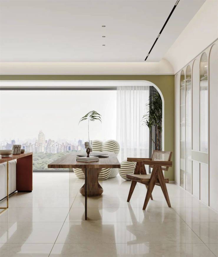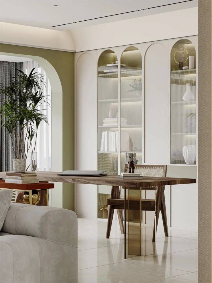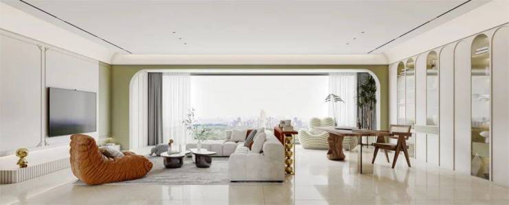以适应现代生活方式的空间布局为出发点,以柔和的色彩铺设,大面积使用了奶白色,加上清新绿的点缀,让视觉陷入温柔的包裹之中,通过经典的装饰细节,保留一点恰到好处的曲线,营造出优雅、细腻、舒适的居家氛围。