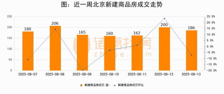 根据北京市住房和城乡建设委员会数据显示,2025年08月13日北京新建商品房成交186套,较昨日减少14套,环比下降7%