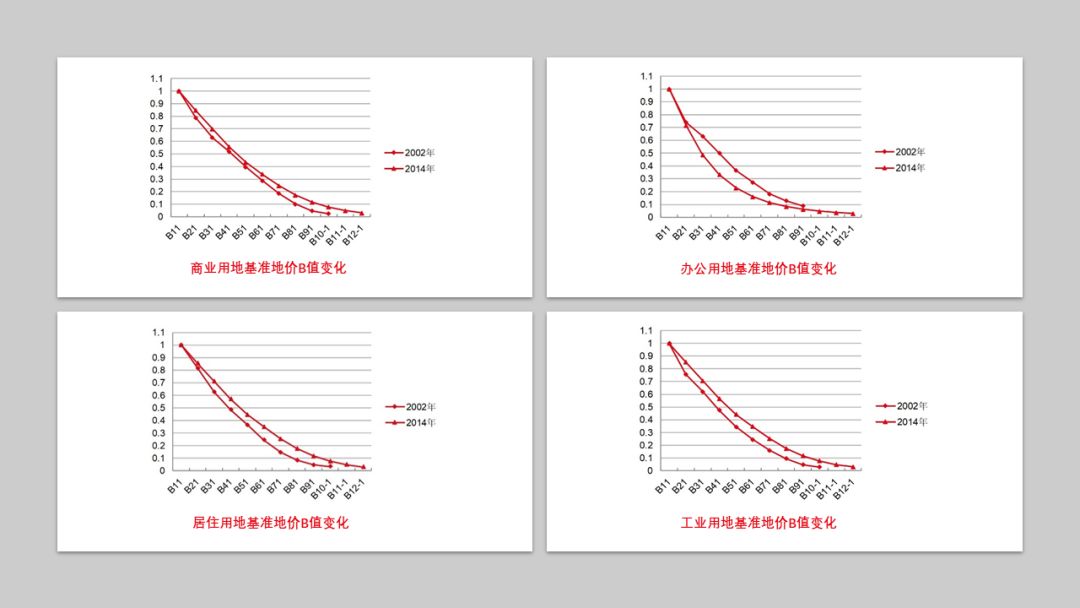 对四种土地类型来说,B值大小与土地等级均为正相关关系。随着各类型用地从I级过渡到XII级,可以看到基准地价逐渐降低。另外,各类用途用地的较佳区域为VI级以内区域;在VI级以外的区域,区位因素对地价影响很小。
