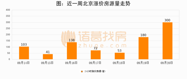 根据诸葛找房数据显示,北京24小时涨价房源量为300套,较09月19日增加120套,环比上涨66.7%。与此同时,涨价房源占比小幅扩大,业主信心有所提升。