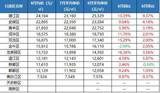 成都市2020年8月二手房价格,11个区域中,只有一个金牛区同比去年同期下跌2.99%;