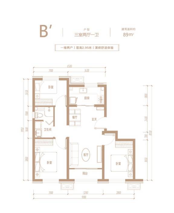 解析:B’户型,89平三居,三面宽朝南,南向整体面宽9.1米;厨房、餐厅、客厅一体化,通透性很好。