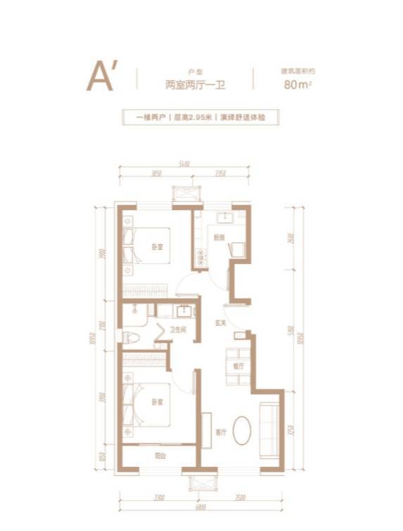 解析:A’户型,80平两居,客厅面宽3.5米,可以保证室内良好采光;南向卧室外带阳台,方便晾晒衣服。卫生间为明卫,整体的尺寸都是不错的,舒适型两居。