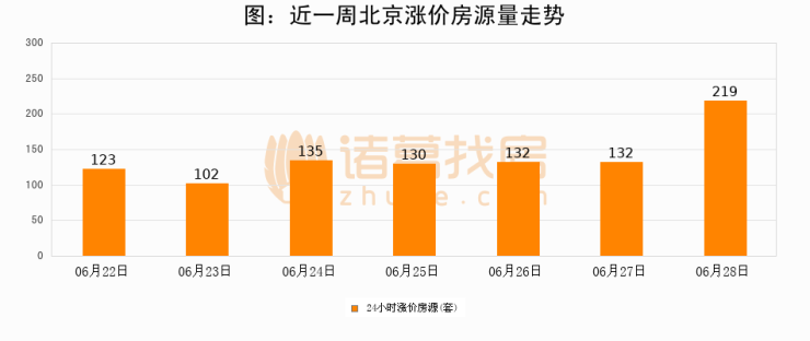 根据诸葛找房数据显示,北京24小时涨价房源量为219套,较06月27日增加87套,环比上涨65.9%。与此同时,涨价房源占比小幅扩大,业主信心有所提升。