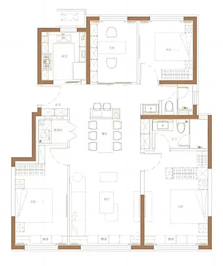 这个户型独立的家政间,独立的洗漱空间,两个南向卧室,主卧也是套间,还可以把书房改成卧室,对于多孩家庭/多代家庭还是非常友好的。