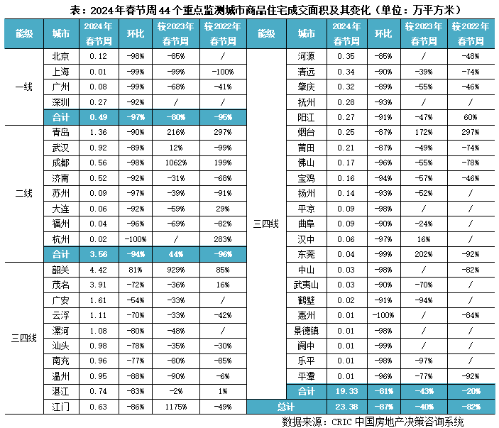 成交方面,44个重点城市在春节周成交量仅为23.38万平方米,环比下降87%,同比下降40%,较2022年同期降幅也达到了82%。