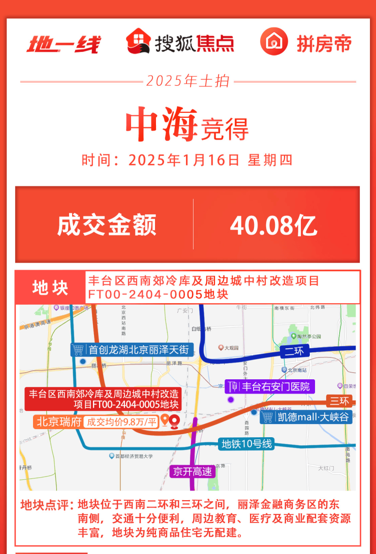 1月16日,丰台区西南郊冷库及周边城中村改造项目FT00-2404-0005地块迎来竞拍,仅中海一家报名并报价,最终中海以40.08亿元底价竞得该宗地,成交楼面价约5.8万/平。值得注意的是,本宗地块没有设置销售指导价。