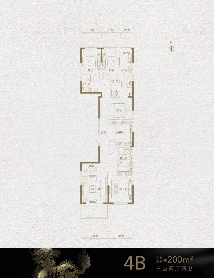4B户型:200㎡,三室两厅两卫,南向两面宽,主卧套房,客厅带有4米宽的阳台。餐厅、两个卧室和厨房位于北侧。户型狭长,餐厅位置采光一般,且有两个暗卫。