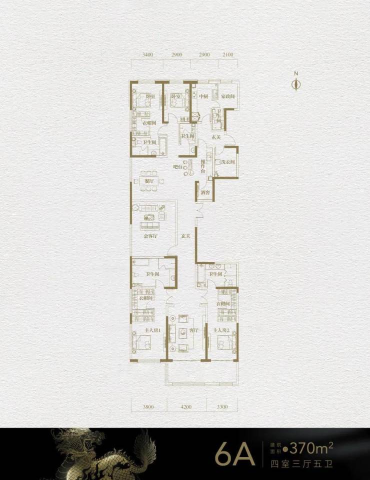 6A户型:370㎡,四室三厅五卫,南向两个主卧套。客厅和其中一个主卧套房带有阳台。
