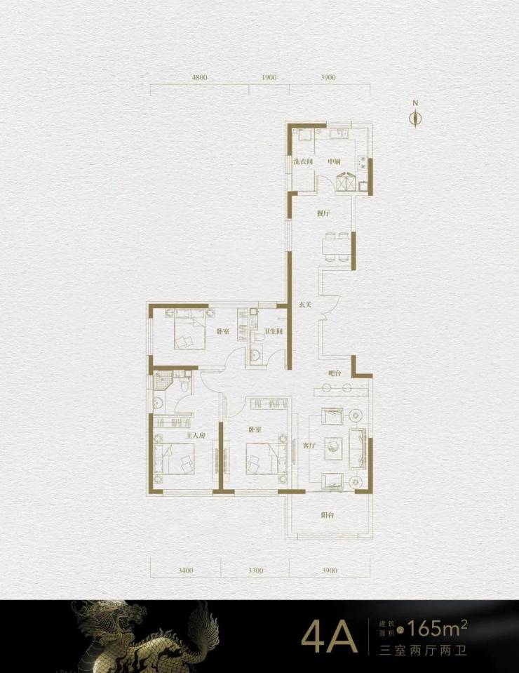 4A户型:165㎡,三室两厅两卫,位于西边户。该户型采用动静分区设计,明厨明卫,拥有两个南向卧室和一个西向卧室。