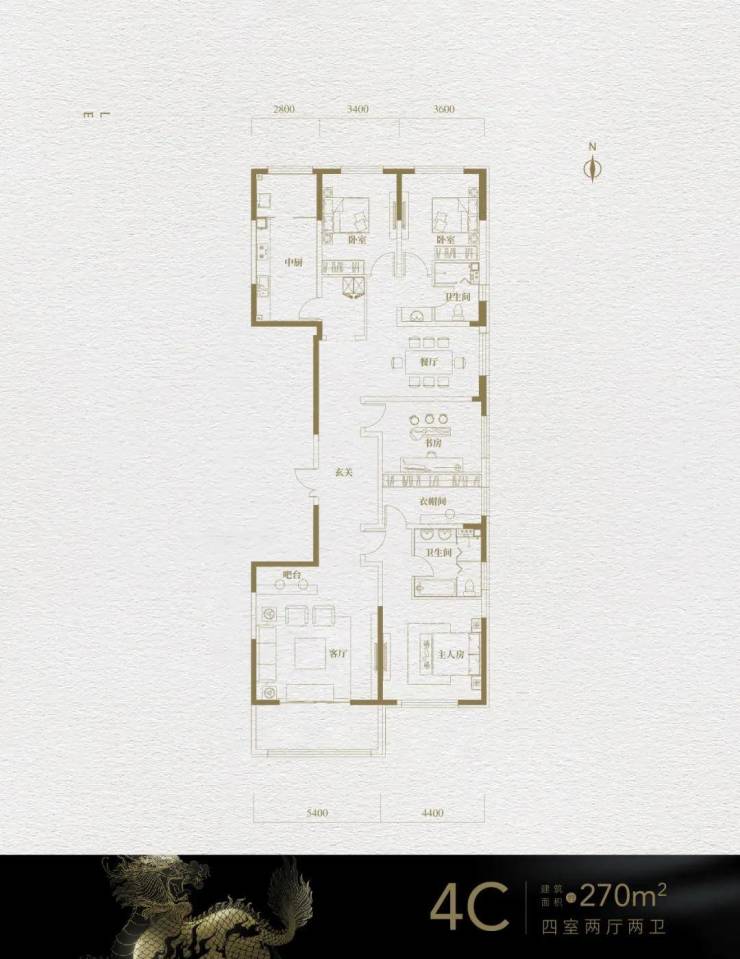 4C户型:270㎡,四室两厅两卫,位于东边户。整体也是偏狭长,但因为面积够大,所以各功能区的采光会好些。