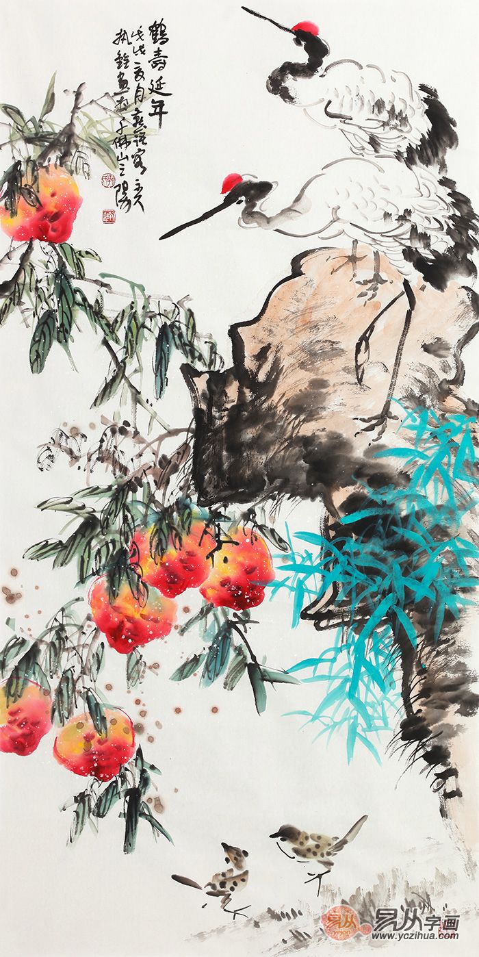 郭执铨桃子仙鹤图《鹤寿延年》(作品来源:易从网)
