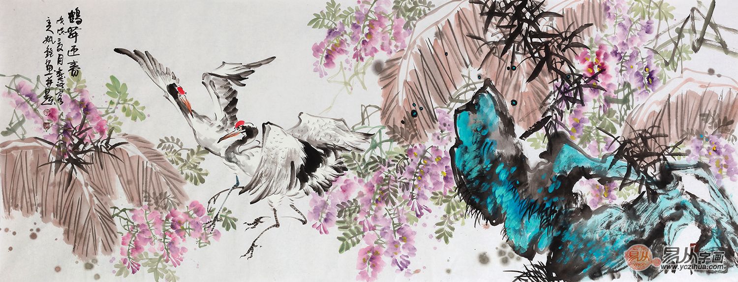 郭执铨紫藤仙鹤图《鹤舞迎春》(作品来源:易从网)