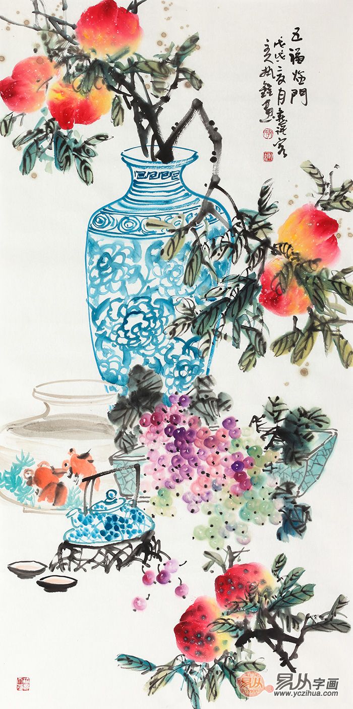 郭执铨精品寿桃图《五福临门》(可在【易从网】定制)