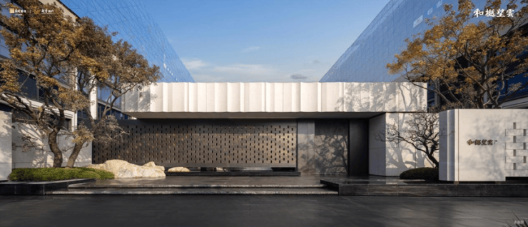 和樾望雲立意东方气韵,采撷皇家宫城府院青釉之形,以西山画屏为灵感打造琉璃景墙,构建出宽阔大气的入口界面,淋漓尽致地展现园区整体高雅格调。