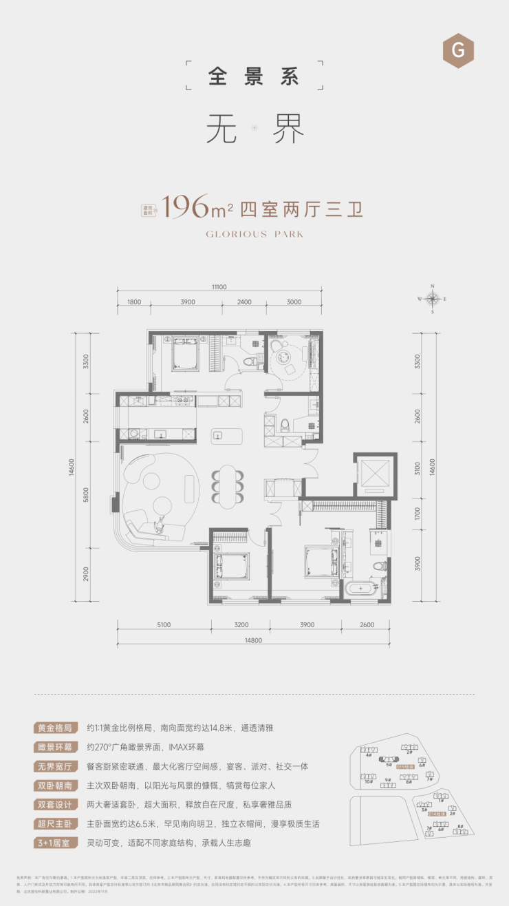 容积率为2.8,总户数818户,层高11-24层,面积段为120-196㎡三至四居。