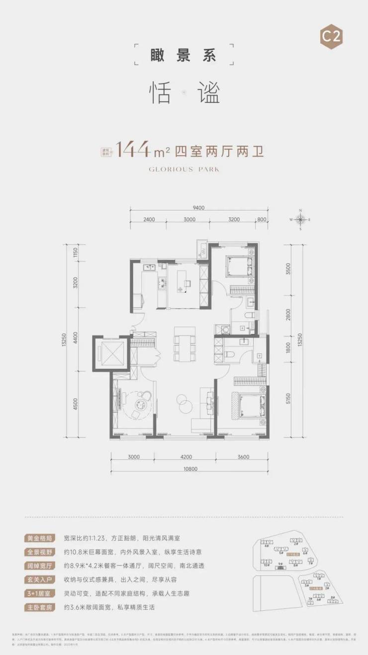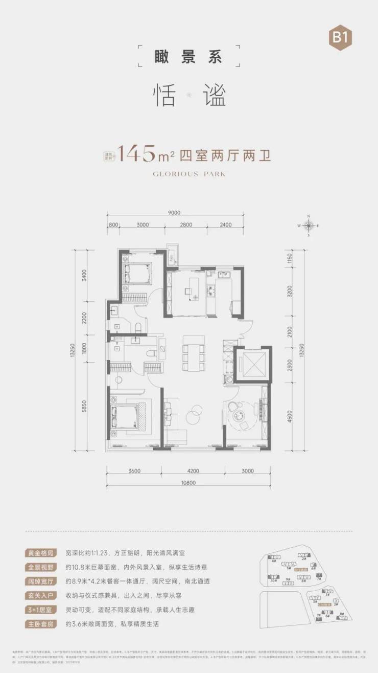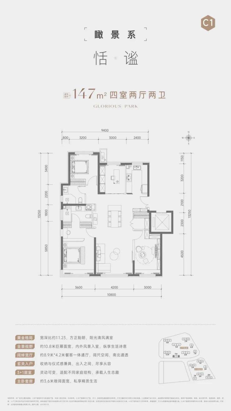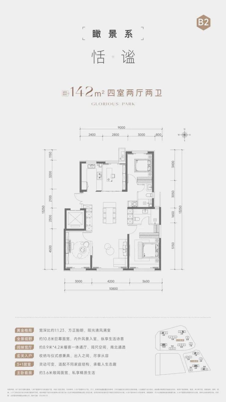 南向约10.8米面宽,客厅面宽4.2米;阔绰的面积贡献给主卧,3+1室,可根据不同家庭需求灵活设计。