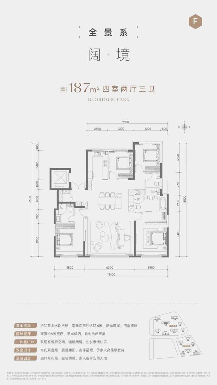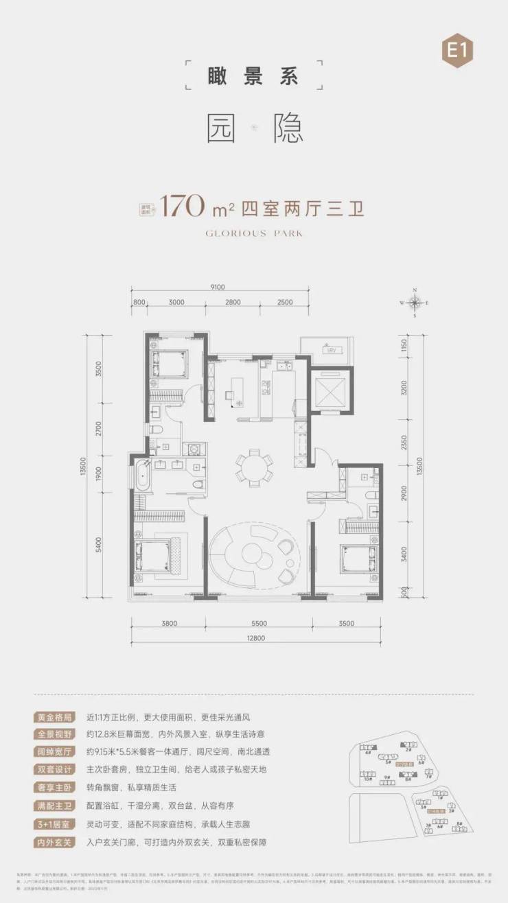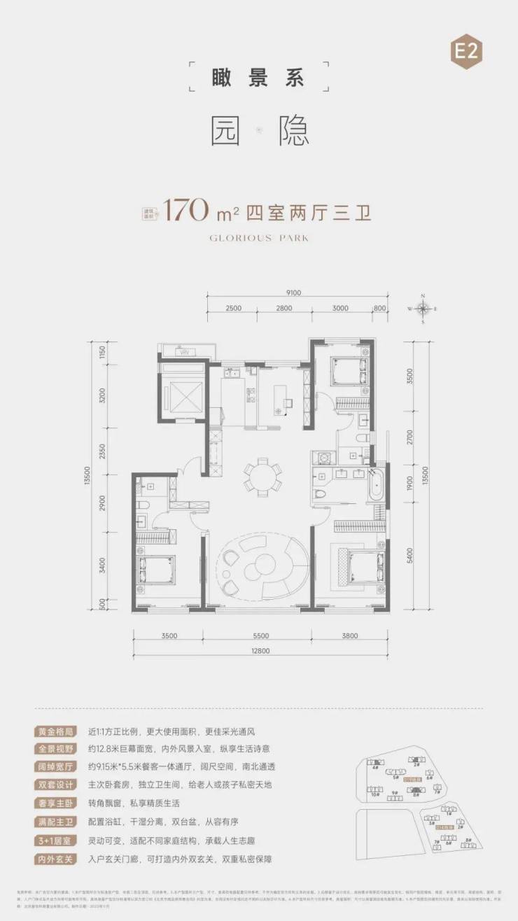 建面约170平四室三卫,入户双玄关,12.8米面宽,依然是LDK+X空间的格局;南向双套房,主卧配置浴缸+双台盆,大尺度让奢居生活更加从容。
