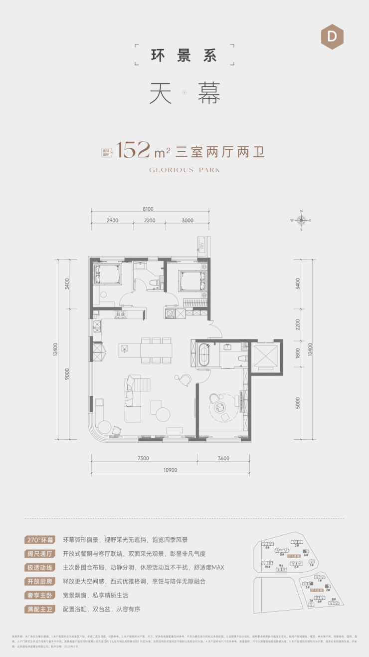 152平三居两卫,弧形落地窗很有特色,开放式厨房+LDK一体式的设计,社交空间很更加阔绰;主卧带有大浴缸,这个面积段做三居,改善气息更加浓厚。
