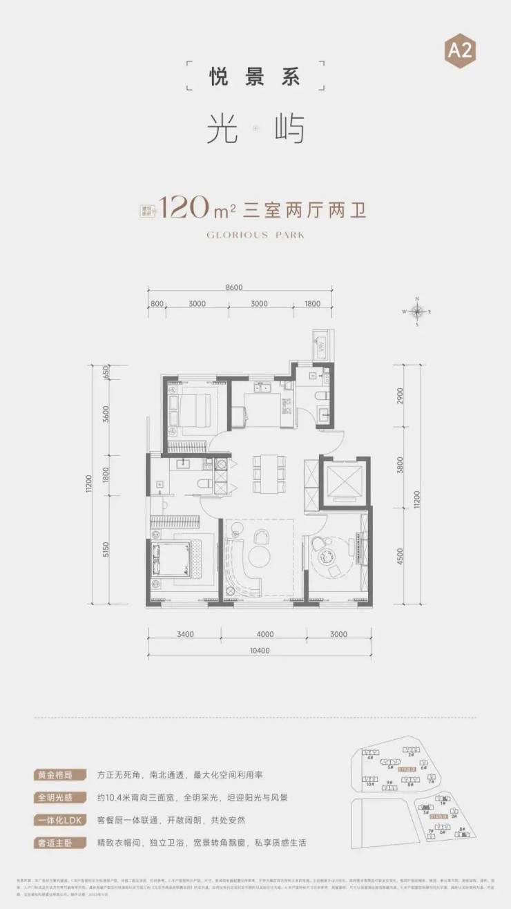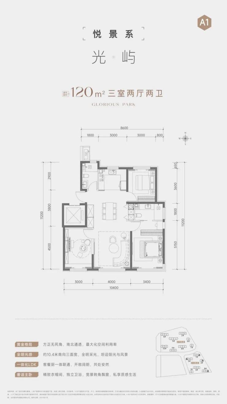 建面约120平三居两卫,南向三面宽10.4米,通透全明,客厅面宽做到4米,LDK一体,主卧套房设计,总价大约在936万左右。