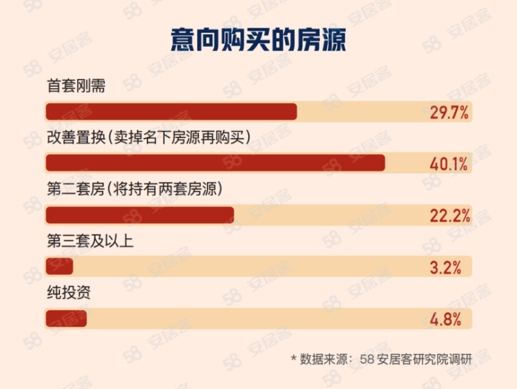 报告显示,改善型意向的购房者偏多,有40.1%的意向购房者想要卖掉目前持有的房源再购买,29.7%是想要购买首套刚需房。此外,有22.2%的意向购房者想买第二套房。