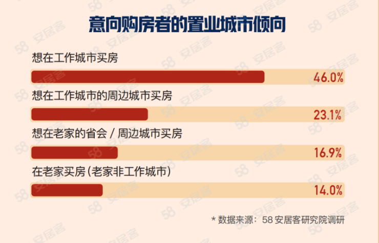 在工作的城市安家,是很多人奋斗的目标。58同城、安居客调研分析表明,选择在工作城市买房的比例达到46.0%,生活环境便利性、教育资源丰富性以及职业发展前景是首要考虑因素;选择在工作城市周边置业的比例为23.1%,越来越方便的交通以及相对较低的房价是主要原因。