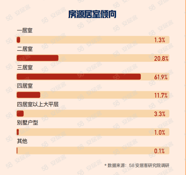 关于购买房源的户型,多数意向购房者倾向选择大空间和改善现有的居住空间,61.9%的受访者选择了倾向三居室,选择两居室的受访者占比为20.8%。